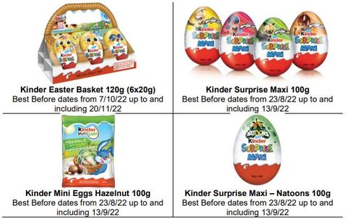 The batches being recalled are the Kinder Surprise 20g egg and the Kinder Surprise 20g three-pack of eggs with best before dates between 11 July 2022 and 7 October 2022.